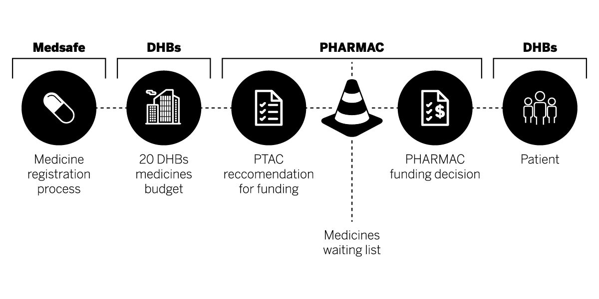 Medsafe is responsible for regulating medicines and medical devices in New Zealand. The 20 District Health Boards (DHBs) have a budget for medicines which PHARMAC (the medicines procurement agency) manages. PHARMAC’s Pharmacology and Therapeutics Advisory Committee (PTAC) reviews funding applications for cost-effective new medicines and PTAC makes recommendations on which medicines should be publicly funded by PHARMAC. Until these cost-effective medicines are funded, they remain on a Waiting List.